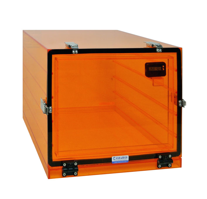 All transparent single door desiccator cabinets are available in clear and UV Amber acrylic, Clear PVC and Static-dissipative PVC. Cleatech’s desiccator dry cabinets with a built-in Hygrometer / Thermometer offer convenient dust and moisture-free storage. Ideal for your bench-top or refrigerator/ freezer. Providing low humidity environment using desiccant or inert gas.